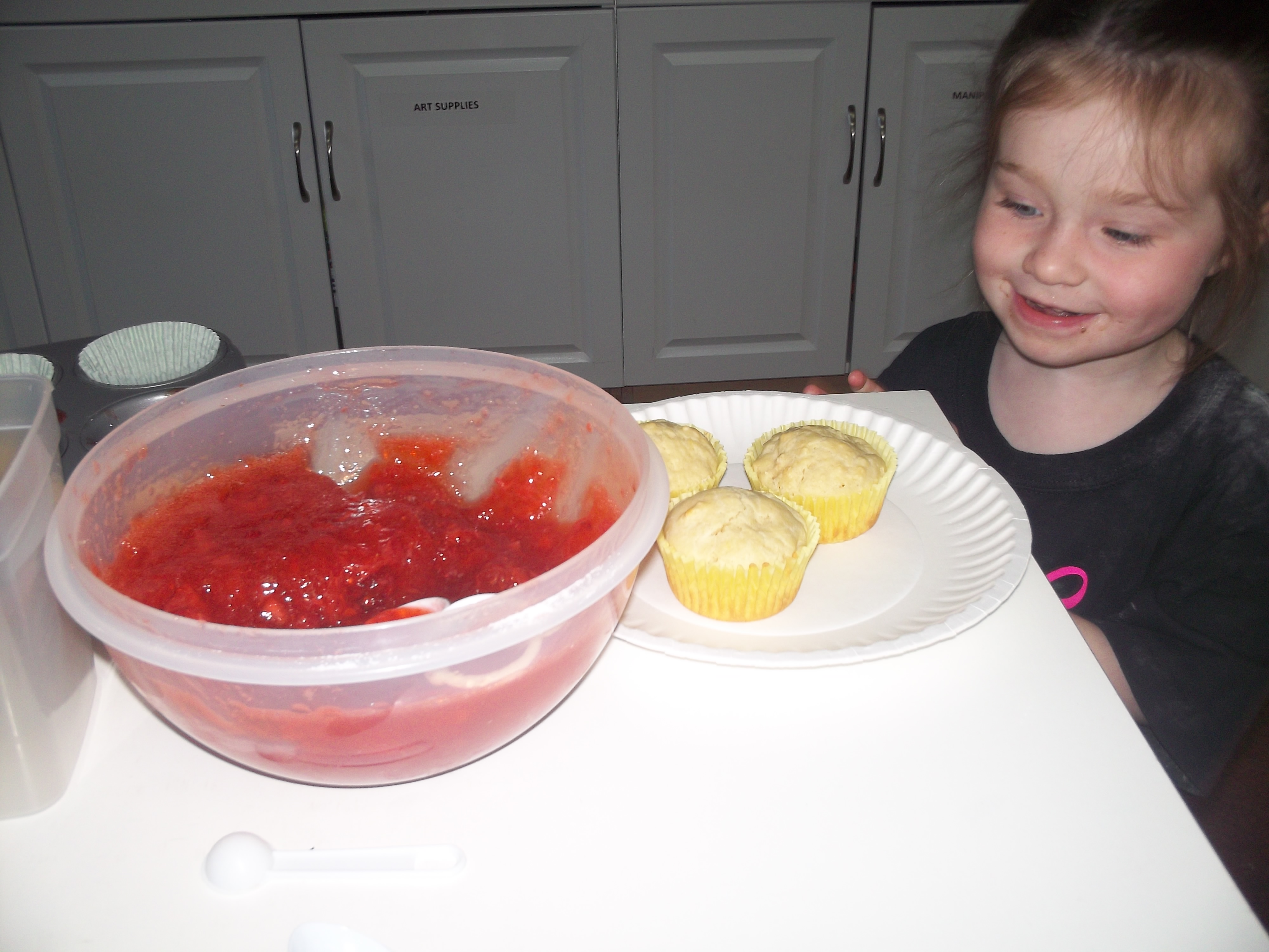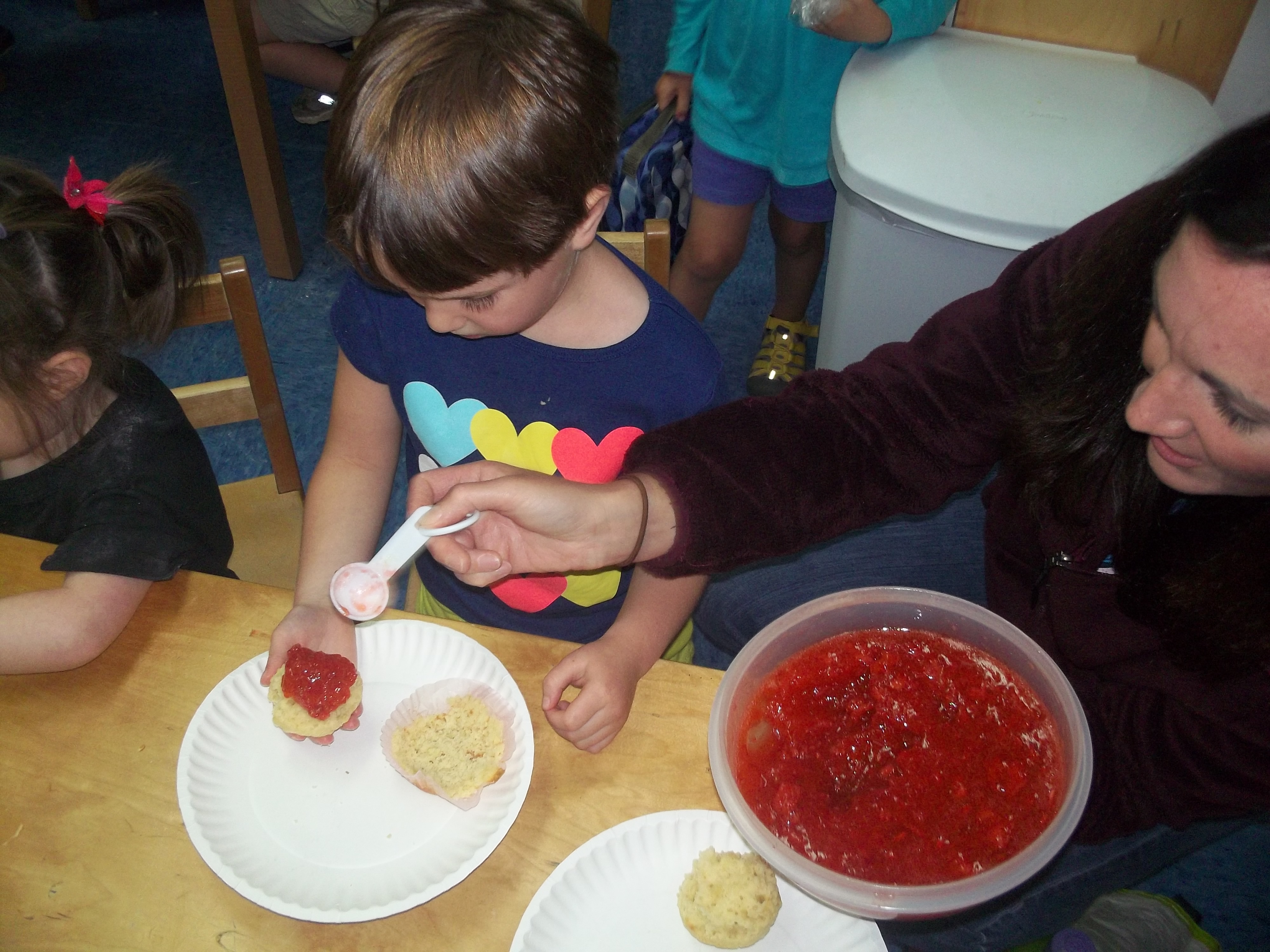 If you are familiar with children’s literature you will recognize our play on words! The Blue Room made strawberry jam and muffins and there is no better book to pair with that project than If You Give a Moose a Muffin by Laura Numeroff . What excitement to see all of the strawberries they so carefully cut up actually turn into jam! On Tuesday, the Blue Room children mixed sugar and pectin and all 4 lbs. of strawberries into a large bowl and put it in the refrigerator over night. On Wednesday, they made muffins from scratch. When they had cooled just enough, they paired the warm muffins with a heaping spoonful of jam (or two or three) and enjoyed every last crumb/drop. Stop by the Blue Room over the next few days to see the children create sock puppets, just as the Moose in the story did!